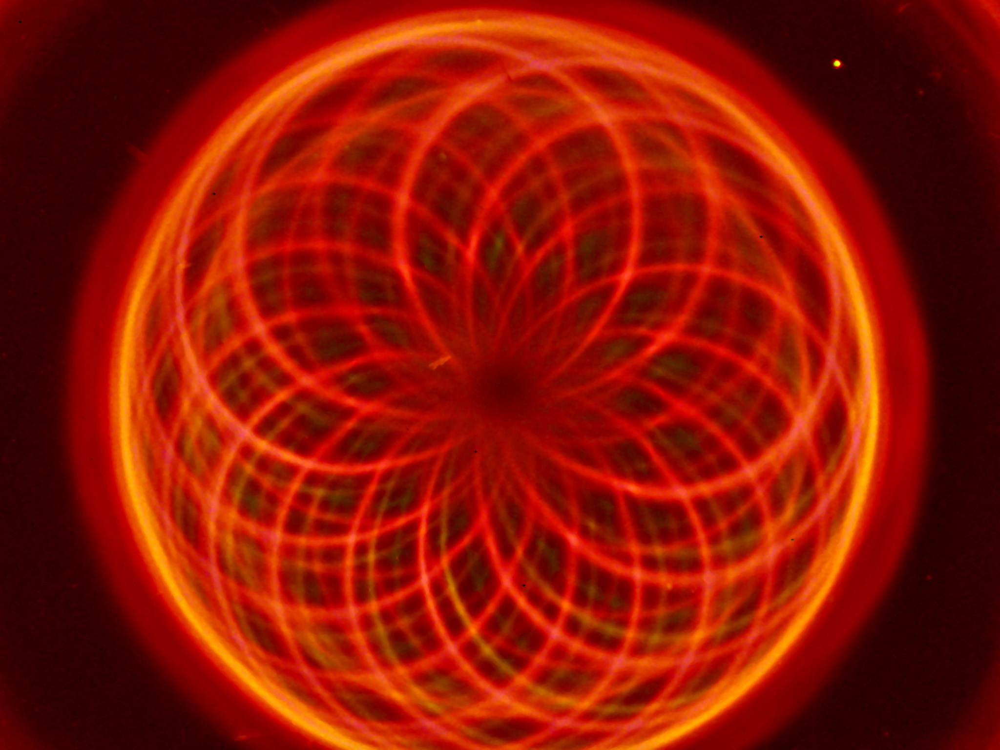 Antivortex quadrupole field with magnets positioned under black paper behind 100x12mm cell. Edge lit 36 RGBY LED's around cell circumference.